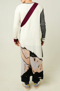 Long cape with a belt obliquely, with ties. Asymmetrical length. Printed fabric.