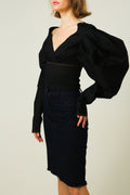 Above the knee skirt with a ventopening on the back. Embroidery on the back of the skirt.