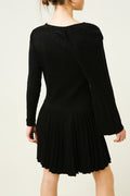 Right sleeve - bat style. The left sleeve is a standard long sleeve. Oval neckline. Pleated skirt.