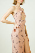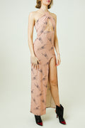 Dress with thin ties around the neck. Maxi length. Slit along the left leg.